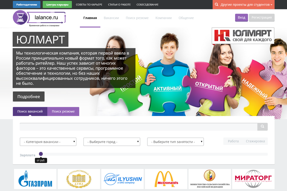 Мы предлагаем Вашим выпускникам действительно серьезные вакансии. Сотрудничающие с нами работодатели не ищут разносчиков газет, они ищут перспективных специалистов, нацеленных на успешную карьеру.